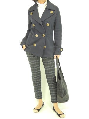一見ベーシックなピーコートは裏起毛のカジュアル素材。楽な着心地なのでデイリーに取り入れたいですね!アクティブ度70%、スタイリッシュ度30%。