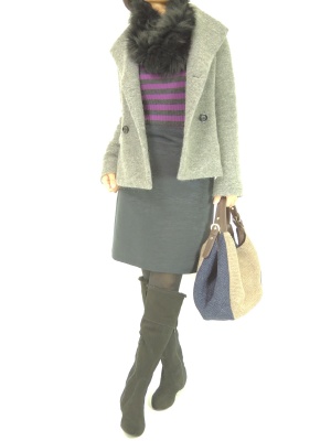 ウォーム感たっぷりのジャケットとクールな質感のスカート。全く違う素材を組み合わせる事がオシャレに見せるポイントです!エレガンス度70%、フェミニン度30%。