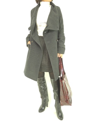 モノトーンでまとめたスタイリッシュなコーディネート。少し短めのスカートならコートとのバランスが良くなります!スタイリッシュ度90%、エレガンス度10%。