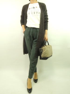 ロングニットカーデはボリュームが少なめのパンツを組み合わせる事によって小柄な方でも着こなせます!スタイリッシュ度90%、アクティブ度10%。