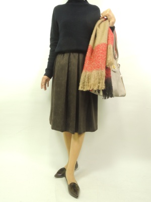 シンプルなニット+スカート。大判ストールで首元をふんわりとさせる。特に赤とかキレイ色が顔まわりが明るくなってお洒落!フェミニン度80%、エレガンス度20%。
