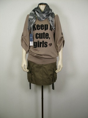 ルーズなロゴニットとストールで上半身にボリュームを持たせた分、ボトムはミニですっきりと!