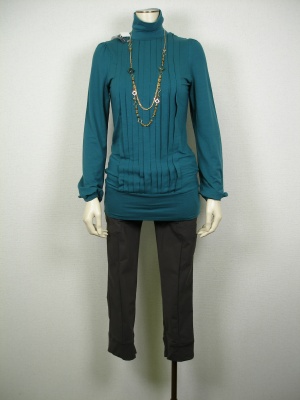 プリーツのハイネックで知的な印象のカットソー。実はバックスタイルが大胆なのです。このギャップがカッコイイ!スタイリッシュ度80%、エレガンス度20%。