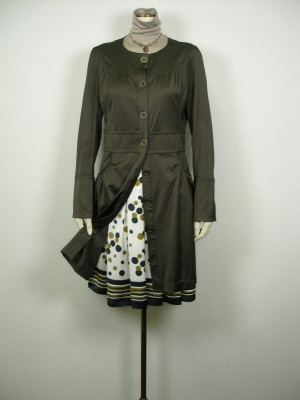 深いカーキ色のコートの中には、カワイイドット柄スカート。コートをぬいでも決まるデザインの効いたカットソーにも注目です。スタイリッシュ度60%、エレガンス度40%。