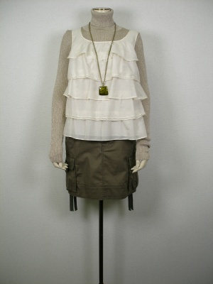 ノースリーブのブラウスは、こんな風にベストとして重ねてもカワイイ。短めスカートにモコモコブーツを合わせると足が細く見えますよ!フェミニン度70%、アクティブ度30%。