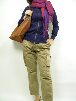 インパクトのあるパープルのブルゾンにベージュのカーゴでナチュラル感をプラス。同系色のストールを無造作に巻いて動きを出して!アクティブ度100%