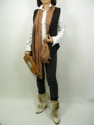 シャツとベストのマニッシュな組合せは通勤にも使えますね。柔らかいカラーのストールで女らしさを少しプラスして!スタイリッシュ度90%、アクティブ度10%。