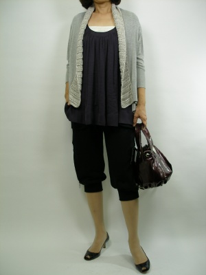 パープルとグレーのシックで大人っぽいカラーリングを、カットソー素材のサルエルで一気に今年顔に!スタイリッシュ度90%、アクティブ度10%。