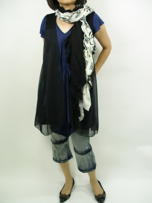上半身にボリュームを持たせた旬のコーディネート。ボトムスをすっきりさせて黒のロングジレを羽織ればすっきり見えます!アクティブ度1005.