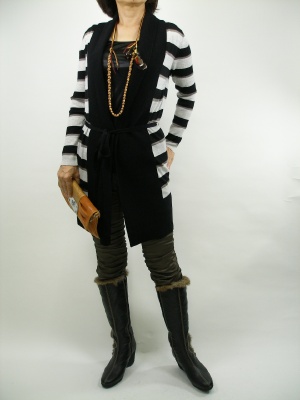 ボーダー柄もこんなスリムなロングカーデなら大人っぽい。ギャザーパンツをブーツインは、この秋定番です!スタイリッシュ度90%、アクティブ度10%。