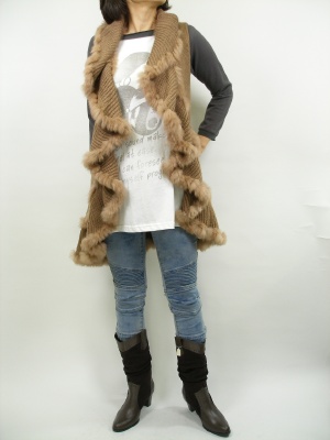 ウオッシュの効いたハードなデニムのロゴカットソーという思い切りカジュアルなコーディネートに、ファーのニットベストを合わせてゴージャス感をプラス!アクティブ度90%、エレガンス度10%。