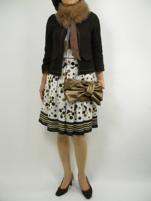 暖かそうなニットジャケットには、サラリとしたポリエステルのスカートを。素材感をMIXさせるのがアカぬけるポイント!フェミニン度90%、スタイリッシュ度10%。