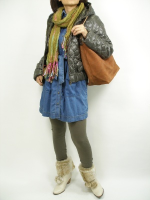 ガーリーなミニワンピには、ボーイッシュなダウンを合わせて。ちょっと緩めのレギンスでキメすぎないカジュアルも良いですね!アクティブ度70%、スタイリッシュ度30%。
