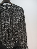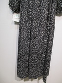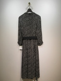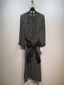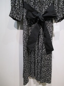 プリントワンピース ウエストゴム入り 袖は若干短め カフス有り フロントギャザー ペチコート付き 後ろファスナー 黒の異素材のサッシュベルト 手洗い可能