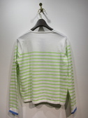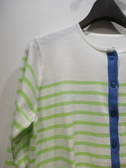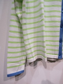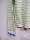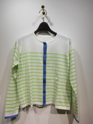 クルーネックカーデ 白地に黄緑色のボーダー 前立と袖口にブルーのライン 半袖のニットID:116335とアンサンブルになります 手洗い可能
