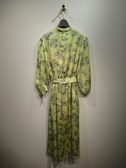 明るめイエローのワンピース、やや光沢感のある生地、紫色の小花柄デザイン、ウェストはゴムでその上から共布のベルト付き、後ろファスナー、ペチコートつき、胸元はギャザー寄せデザイン、七分袖