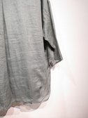 深いV開きのシャツタイプ ドロップした袖 袖筒は袖口まで同寸 袖口スリット入り 裾は大きくラウンドして脇は深めに開いてます 後ろ身頃タック フロント胸に大きなポケット 手洗い可能