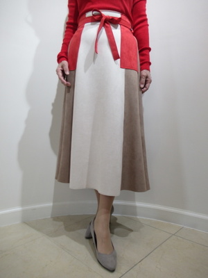 フェイクスエード生地 いろんな色のパッチワーク 裏地なし ウエストは後ろゴム入り リボンベルト ベルト通しは丸い金具あり
