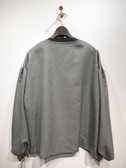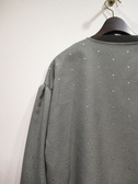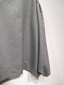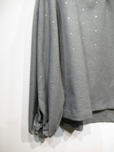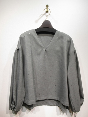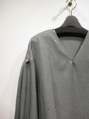 Vネックのブラウス、ドロップショルダー、袖の付け根タック入り、袖口ギャザーゴム、前後差あり、両脇スリット、シルバーのドット、Vネックの先タック入り