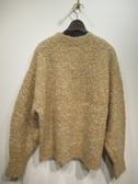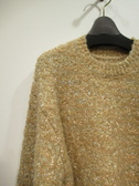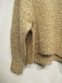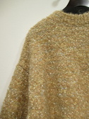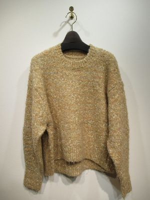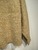 糸はリボンヤーンを織り交ぜた編地のため少し光沢がある ドロップショルダーで袖筒広め 袖口 裾 襟ぐりリブ 裾は前後差有り 手洗い可能