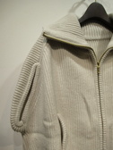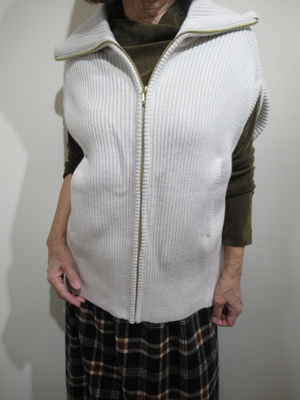 畦編み ざっくりタイプのニットベスト ゴールドのファスナー(襟まで閉じれます)袖はドロップして二の腕のあたりから腕が出るようなシルエット ポケット有り