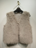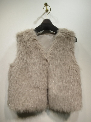 フェイクファーのベスト(ラメ入り)、Vネック、フロント鍵ホック1つあり、裏地付き