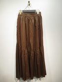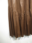 ポリエステルにロウ引きのようなコーティングがされたツヤ感ある生地 ギャザースカート 中央に切替あり(フロントは上の方から後ろ身頃の方にかけて緩やかに下がって切替え) 裏地あり 横ファスナー 脇ポケットあり ウエスト後ろギャザーゴム 手洗い可能