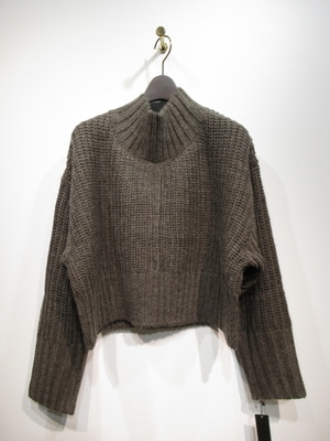 畦編みの短丈ニット ボリューム袖で袖山は白の糸でラインが入ってます ハイネックの襟と裾、袖口はリブ 手洗い可のう