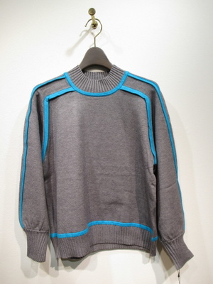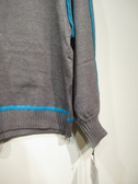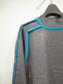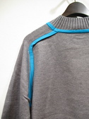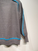 身幅広め、袖は変形ラグラン、袖筒ひろめ、裾と襟ぐりと袖はリブ、配色のライン入り(白が黒のライン・グレーが明るめのブルーのライン・黒はネイビーに近いブルー)、手洗い可能