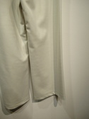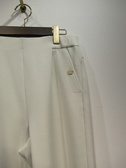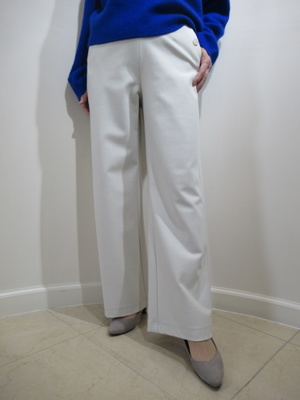ウェスト後ろゴムのソフトワイドパンツ、脇ポケット、飾りボタンあり、裏地無し、手洗い可