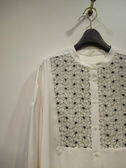 襟無し 前開きブラウス ドロップショルダー (袖口ギャザー+カフス) 脇スリット入り 前身頃シフォンに花の刺繍の生地を重ねてます)手洗い可能