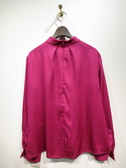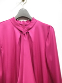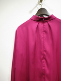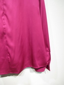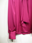 光沢のある ポリエステル生地 濃いピンクがかったパープルです 後ろファスナー フロントのタイは片方がフリルでやや広がるデザイン もう片方の細いリボンを通して垂らすデザイン 袖口カフス(ゴールドのボタン)手洗い可能