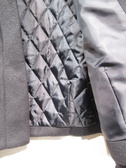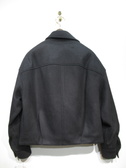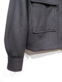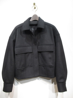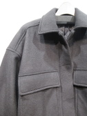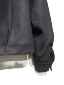 ウール見えするポリエステル生地 ステンカラー 身頃広めでドロップショルダー 袖口カフス 後ろ裾はタック入りのコクーンシルエット フロントホック 裏地キルティング 手洗い可能