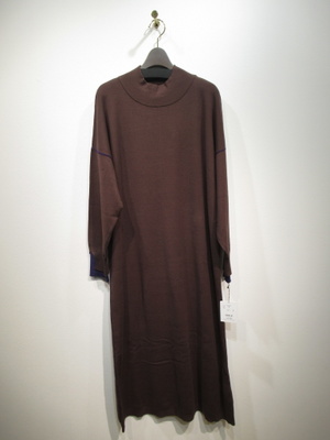 ハイネックニットワンピース ドロップショルダー 袖口(2枚合わせ) 脇ライン 袖付け根 紫色のライン 手洗い可能