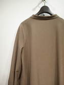 ヘンリーネックのワンピース、身頃のボタンはゴールド、裾は脇がラウンド、ポケットあり、裏地なし、手洗い可能