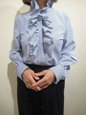 ※春物新作 ストライプ柄のシャツブラウス、前立てから襟ぐりフリル仕様、フロントは比翼、第一ボタンと袖口のカフスはシルバーボタン、手洗い可能