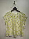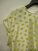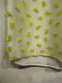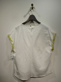 前後異素材使用 フロントは光沢のあるポリエステル生地に黄色で立体的な花のモチーフ 後ろは無地の綿素材 裾は前後差あり フレンチスリーブ(袖口折り返し)後ろネックのところにボタンあり 手洗い可能