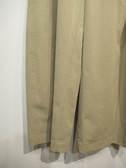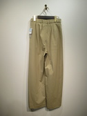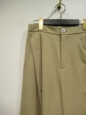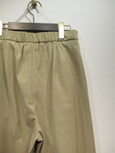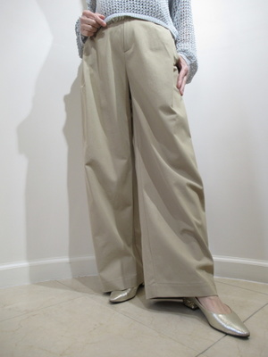 脇に近い部分のタックが入っている、太めのワイド、脇ポケットあり、裏地無し、前ファスナー、ウェスト後ろゴム、手洗い可能