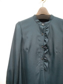 細かい小紋柄のワンピース、フロント前立てフリル使い(前立てにボタン4つあり)、袖はギャザー袖でカフスあり ペチコート付き