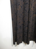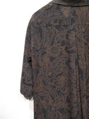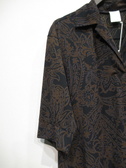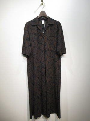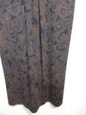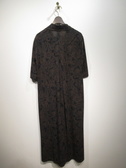 皺になりにくい上質ポリエステル生地の開襟ワンピース 黒地にダークブラウンのペーズリー柄(輪郭にブルーの色を入れてます)脇ポケット 裏地無し 無地で同型有りID:118943(値段は違います)また同生地を使ったパンツ有り(ID:118941)手洗い可能