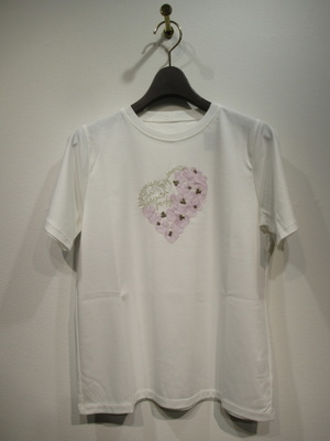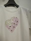 クルーネックの半袖カットソー フロントにシフォンの生地でアップリケしたハート型シルバー系の刺繍糸のロゴとゴールドのスパンコール 生地は艶のある滑らかな素材が特徴(着心地は良い)手洗い可能