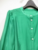 裾広がりのノーカラーブラウス、袖肩にギャザー、袖筒はやや広め、袖口カフス(ギャザー寄せ)、手洗い可能