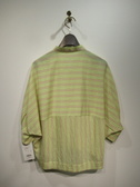 襟無しドルマン袖のシャツ、前開き(比翼)、第一ボタンはシルバー、前後差あり、コクーンタイプ、手洗い可能、ベージュ系の柄