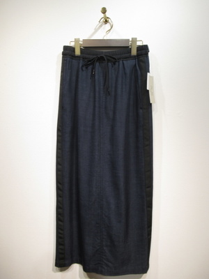ダンガリー生地のタイトスカート、裏地無し、ウェストギャザーゴム、ドロスト、インベルが異素材を使用・・・ブルーはブルー・ネイビーは黒(脇のグログランテープも同様)、脇ポケット、手洗い可能、後ろスリット入り(31cm)