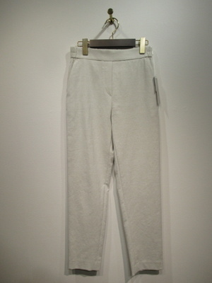 ウェストゴムのテーパードパンツ、祖座は麻混入り、脇ポケット、手洗い可能