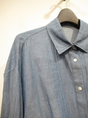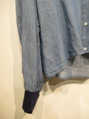 ダンガリー素材のシャツ ドロップショルダーで身幅広め 袖口ネイビーのカットソー地 前上がりの裾 手洗い可能