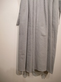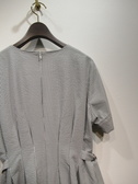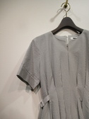 細めのストライプ、中央に(フロントバックともに)タック入りで立体的に、縦の切り替え、ウェストには両サイドにベルトデザイン、首元浅めのVスリット、裏地無し、手洗い可能、後ろファスナー