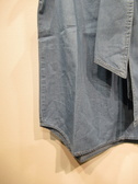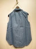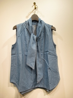 ダンガリーデニム地のノースリーブ、ボウタイブラウス、ボウタイは身頃につながってます、ネックの後ろギャザー、フロントスキッパー襟、裾ラウンド、手洗い可能