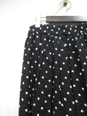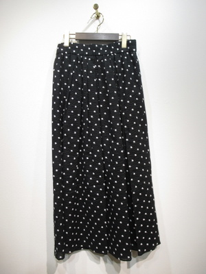 ウェストギャザー、くるぶし丈のスカート、裏地付き、サッカー地に白の小花刺繍、手洗い不可(クリーニング使用)