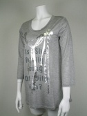 箔プリント仕上げ。七分袖で着丈長め Aラインのため裾の広がりがある
